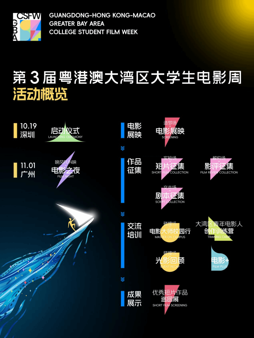 第3届粤港澳大湾区大学生电影周主题为“少年驭光,帧见未来”。10月19日下午,电影周将在深圳大学粤海校区演会中心启动。